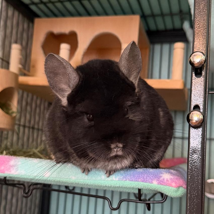 Cheska, 13 years old, Black Velvet Chinchilla (Chinchilla chinchilla, formerly Chinchilla brevicaudata). Cheska is sassy, stubborn and food-motivated.