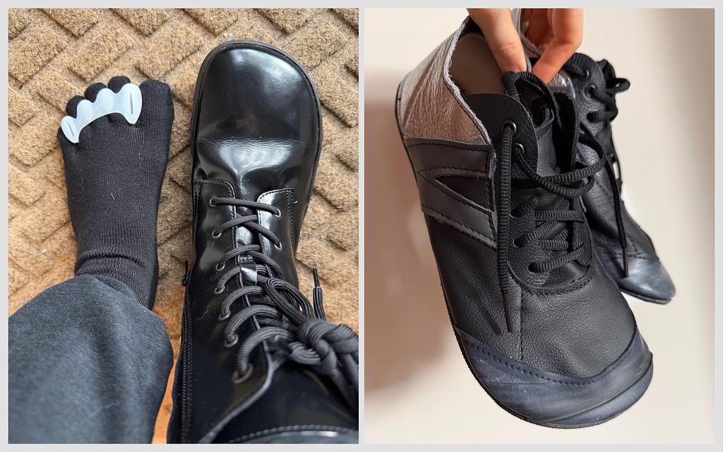 Laura has been continuing her journey on improving the functionality of her feet, ankles, etc up the postural chain. It has now been 2 years that she has been in the Correct Toes toe spreaders full time, day and night and the changes have been transformative on her gait and alignment. This year, she scoured high and low looking for shoes to fit her newly expanded feet and straighten toes. Even Louis got roped into some new barefoot, wide toe box shoes.