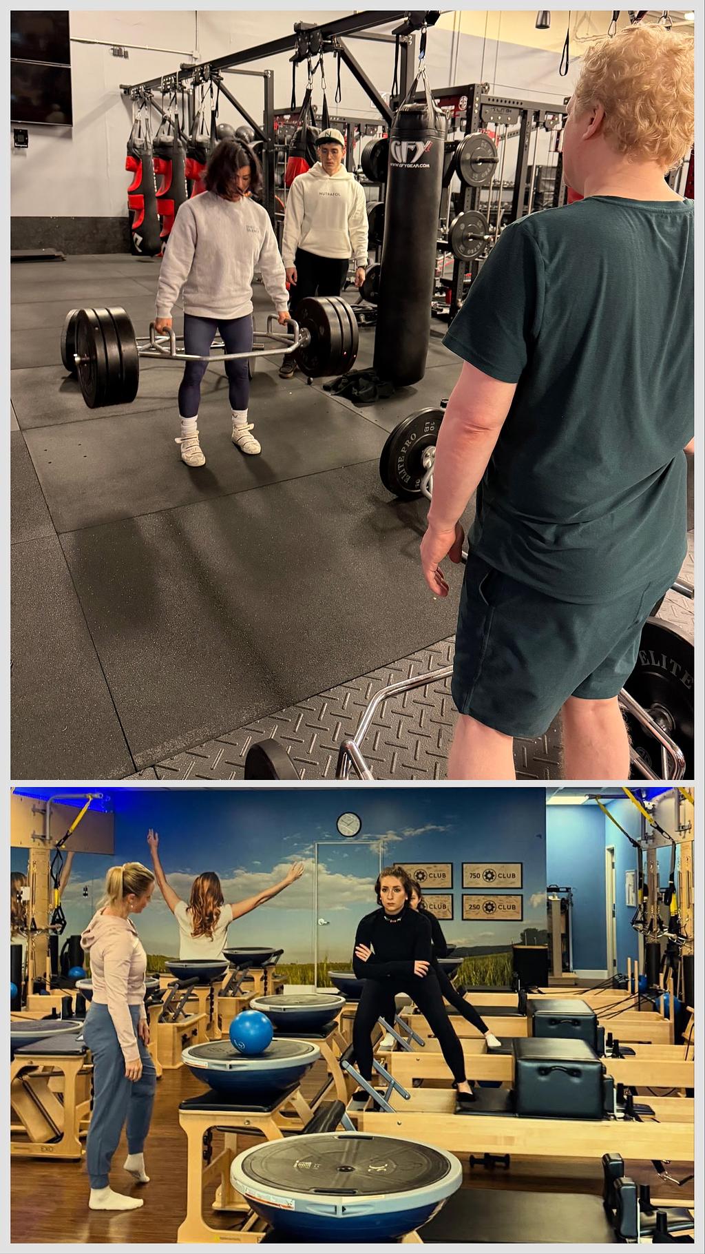 Louis watching our friend, Emily, demonstrate proper weight lifting technique. Laura & her sister-in-law, Mara, enjoying pilates practice.