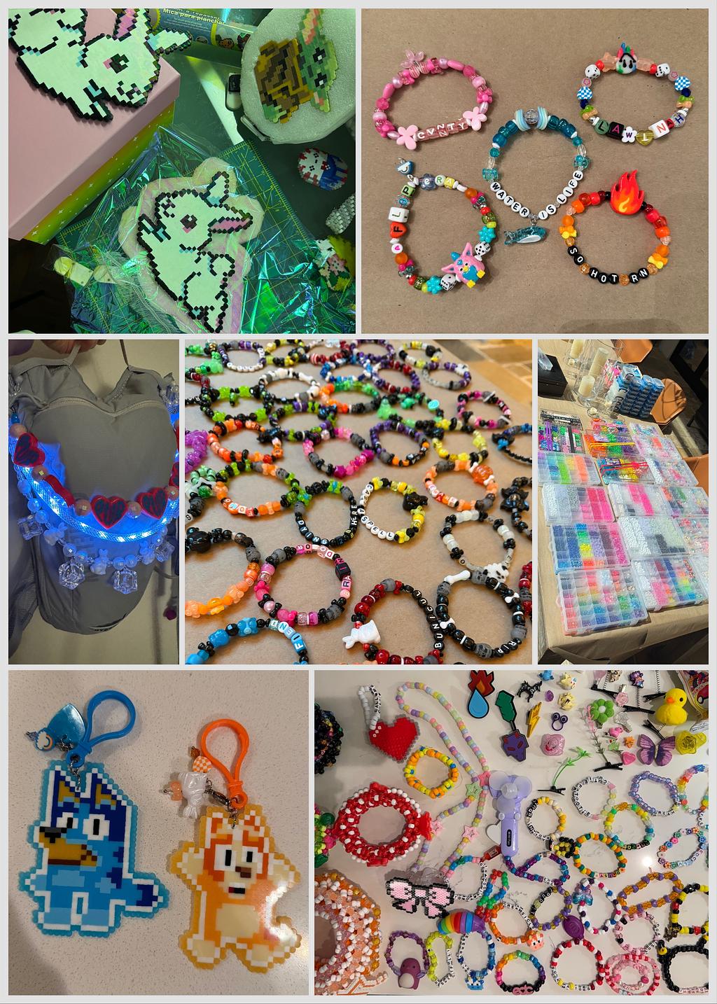 Kandi making continued to be a special interest for Laura. This was the 3rd year she made bracelets for Halloween trick-or-treaters. She traded tons of kandi at EDC (recieved kandi & goodies from trades in bottom right). She made a rave totem (top right) which we used to keep track of each other at the festival with great success. Laura also made Bluey backpack charms (center left) for her niece & nephew.