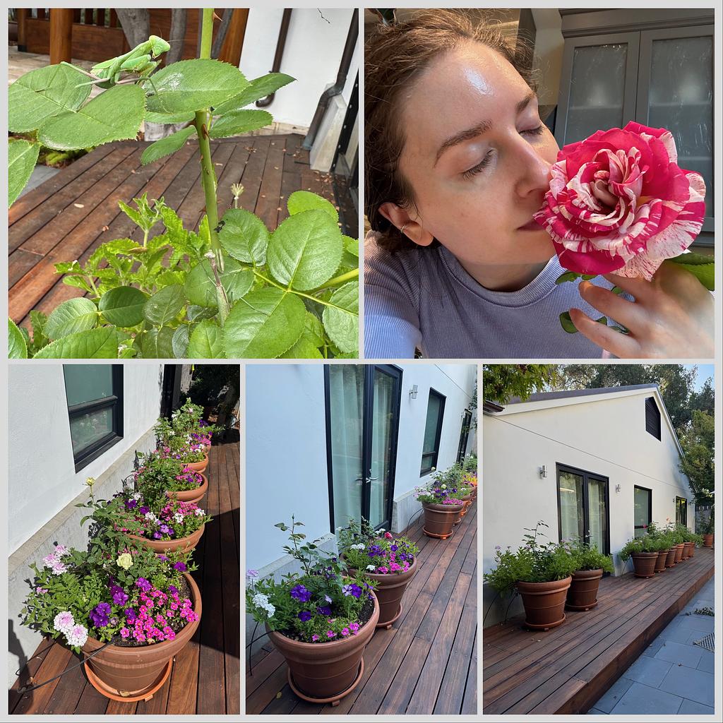 In May, we planted 9 large rose containers for our courtyard. Over the months, every possible aliment has felled these plants: squirrels, caterpillars, moths, black spot, powdery mildew, spider mites, thrips, drought, sunburn- you name it, it has happened to these roses. This project was both a source of joy and growth for Laura but also a lot of frustration and labor.